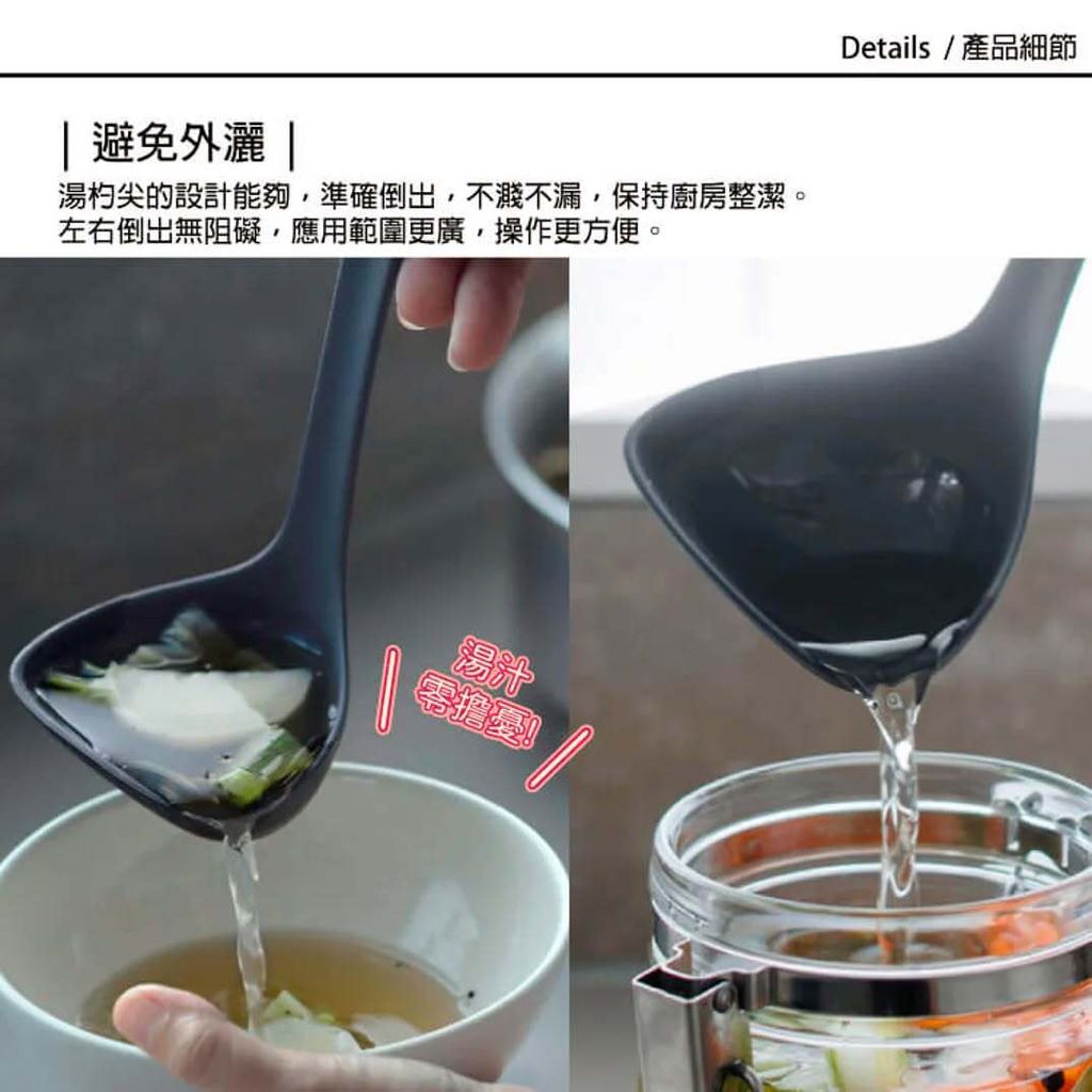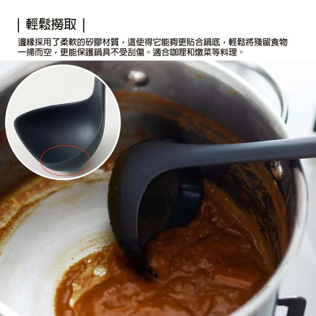 這支湯勺設計的底部可貼合鍋底喔,且湯勺尖端也不易濺出。