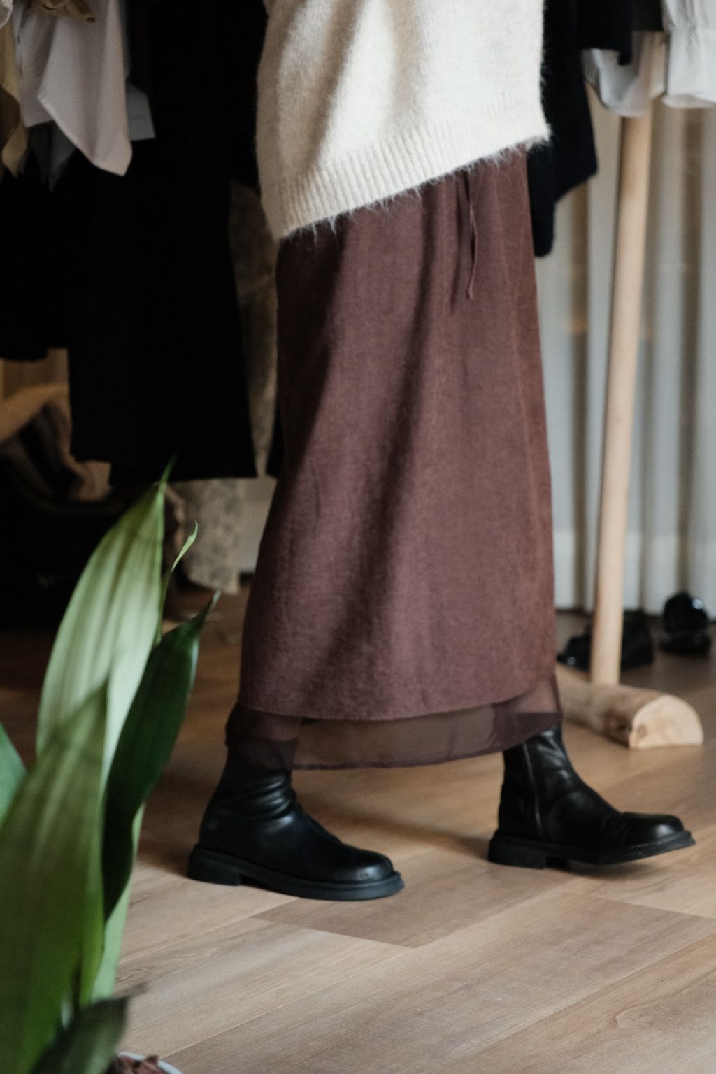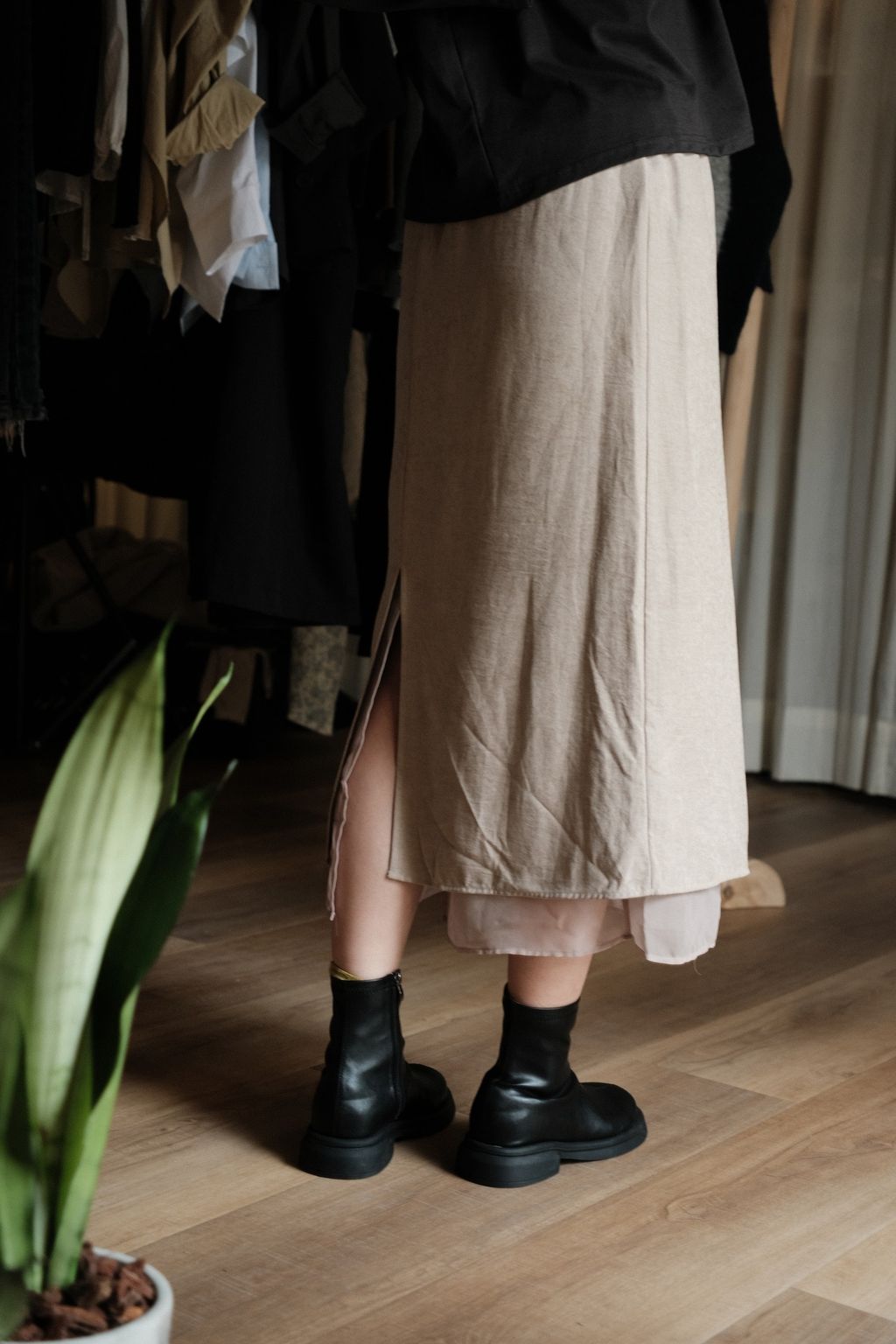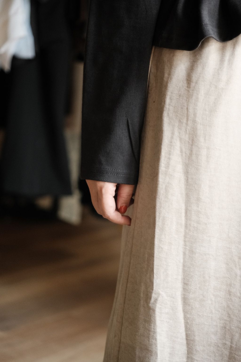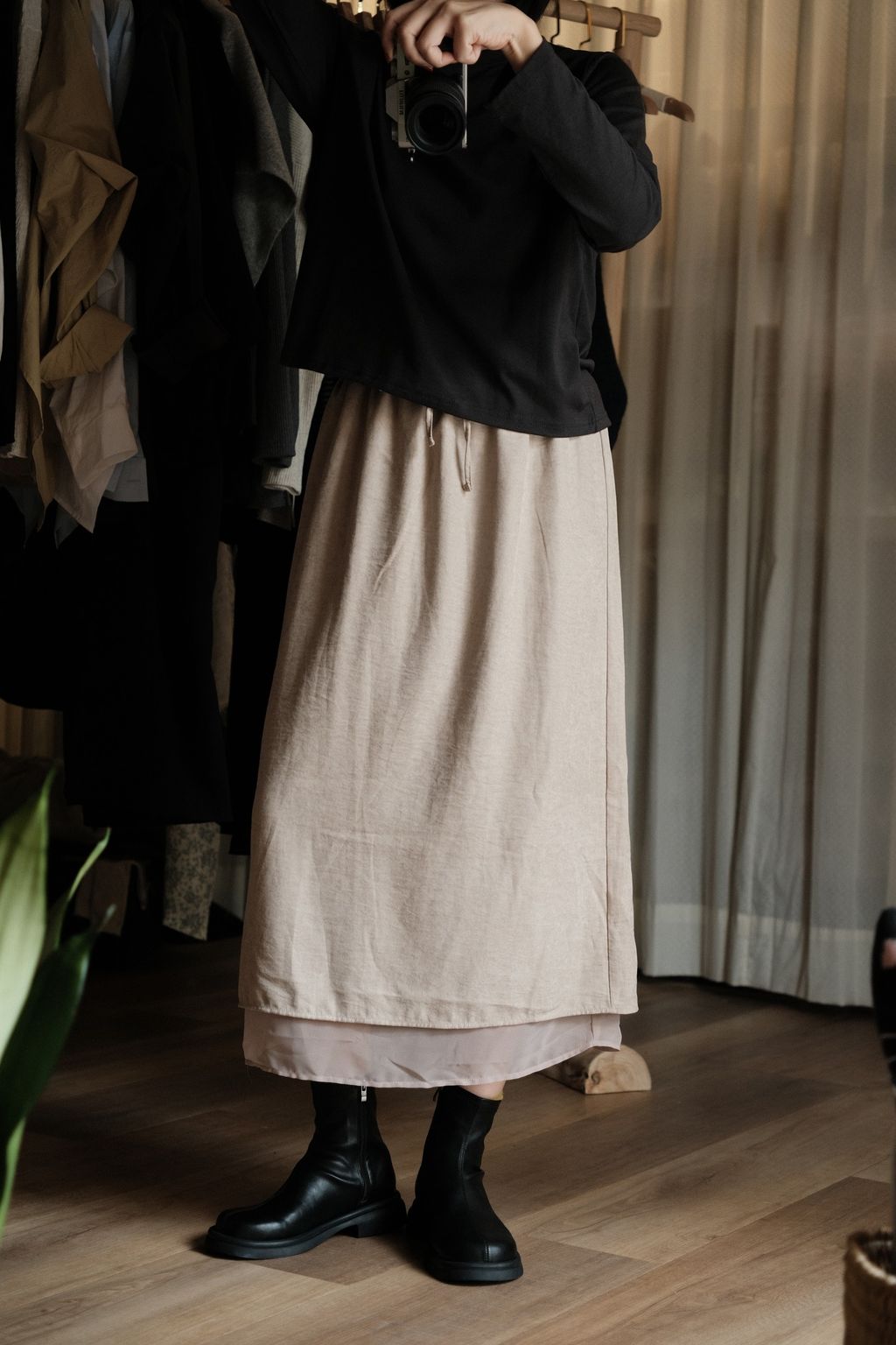 裙身裡層有一層細緻薄紗,走動時會透出一點層次與柔和光澤,低調卻超級有質感。