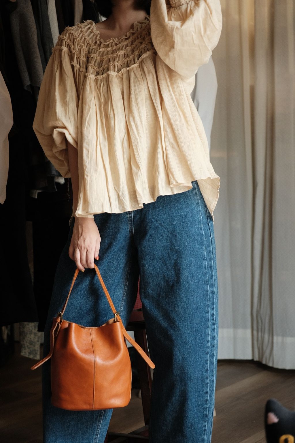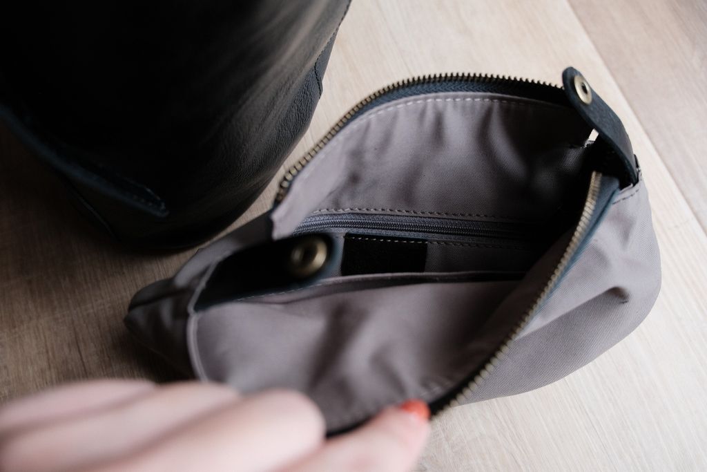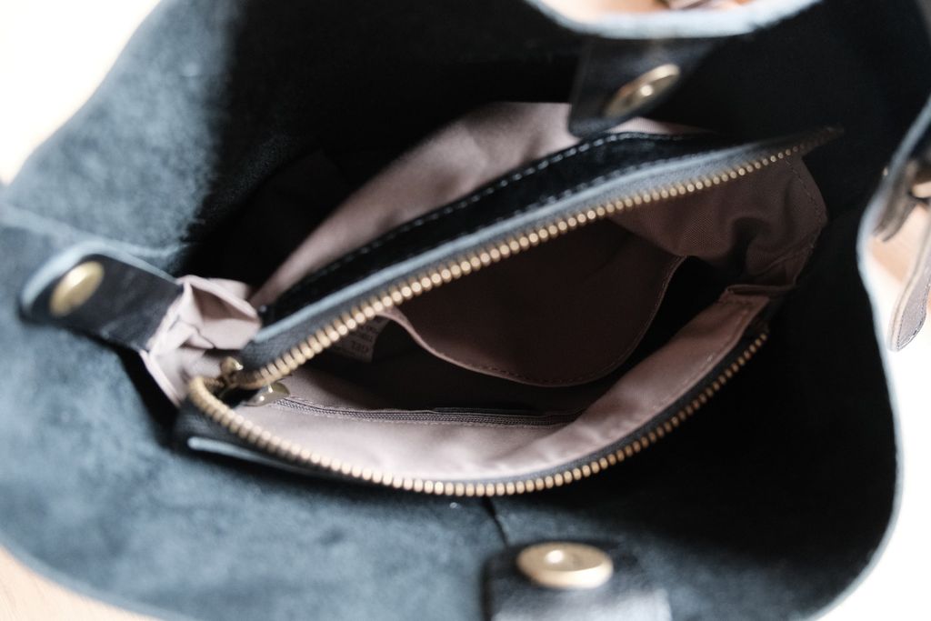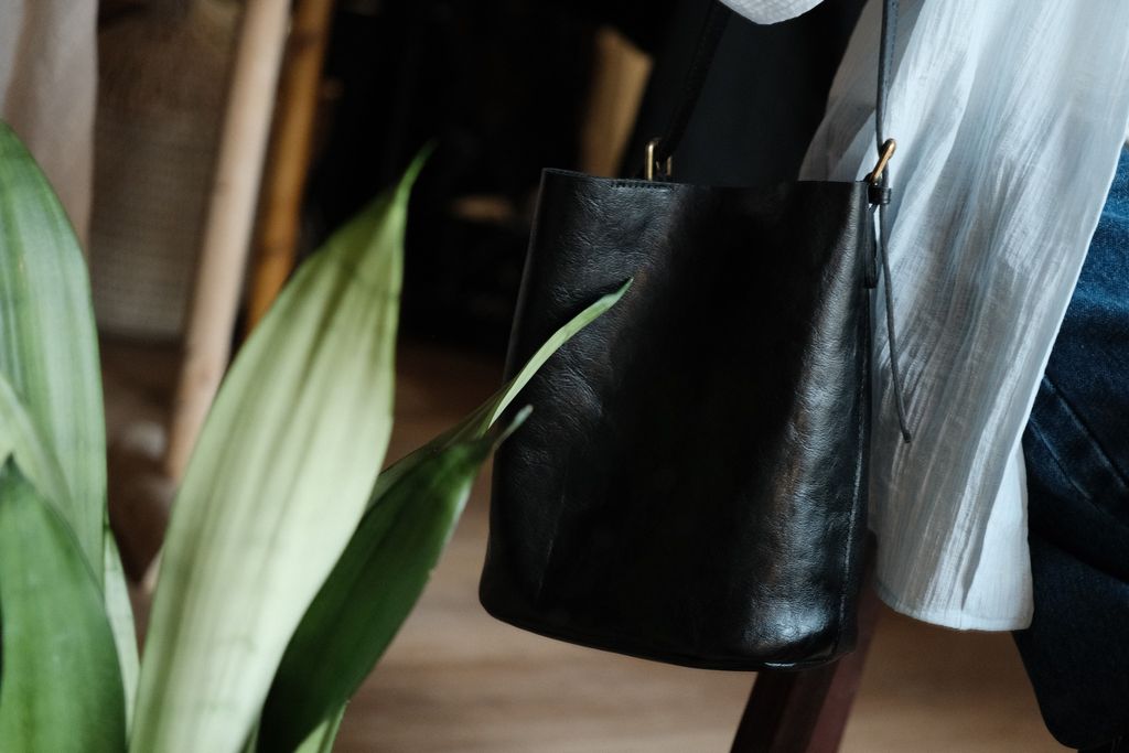 這款包的挺度很好,直接放著可以維持漂亮的桶型線條,不會塌;看起來小但是容量也很夠喔,機、長夾、小水壺、相機都能放得下。