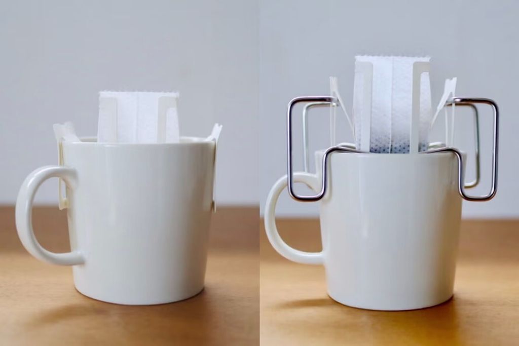 不銹鋼的支撐架能夠輕鬆簡單的直直架立在杯上,只需要掛上掛耳濾包,倒入熱水時即可看到倒了多少的水量,最棒的是就算倒滿後也不會讓濾掛包的底部碰到咖啡。