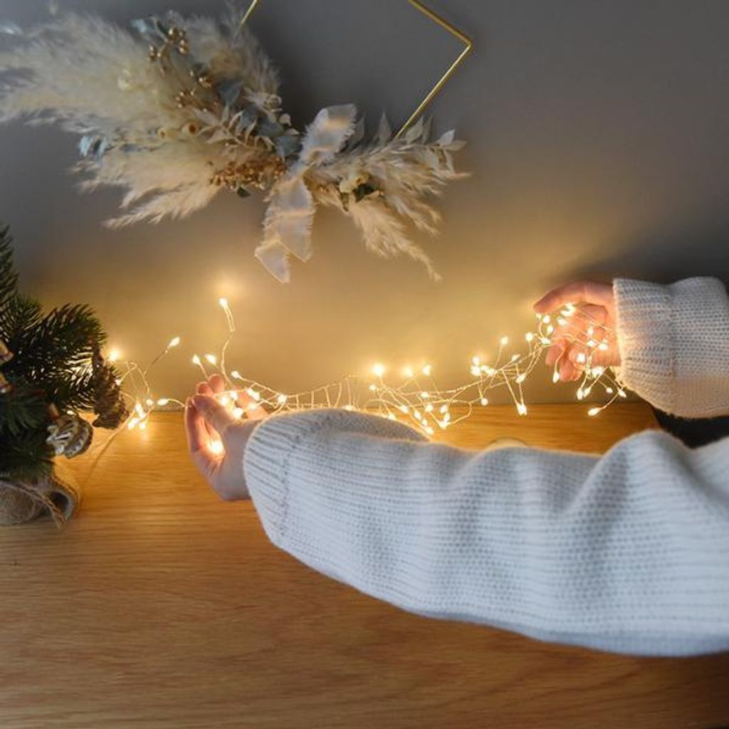 非常優雅低調美麗像小樹枝一樣放射狀的小小燈泡,銅細線尖端上有LED燈,總共有120個,可以直接垂墜掛飾也可以纏繞放在玻璃瓶裡面,放置在聖誕樹上或是妝點家中,露營等等燈能精巧的裝飾各個角落,