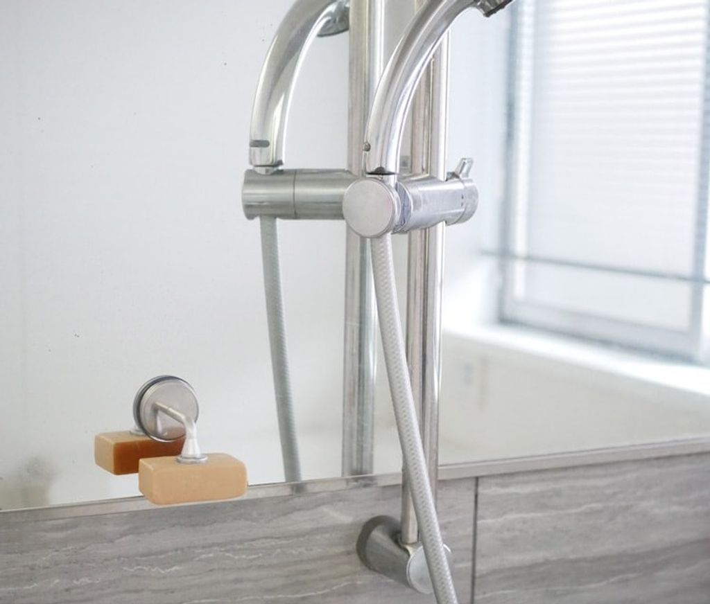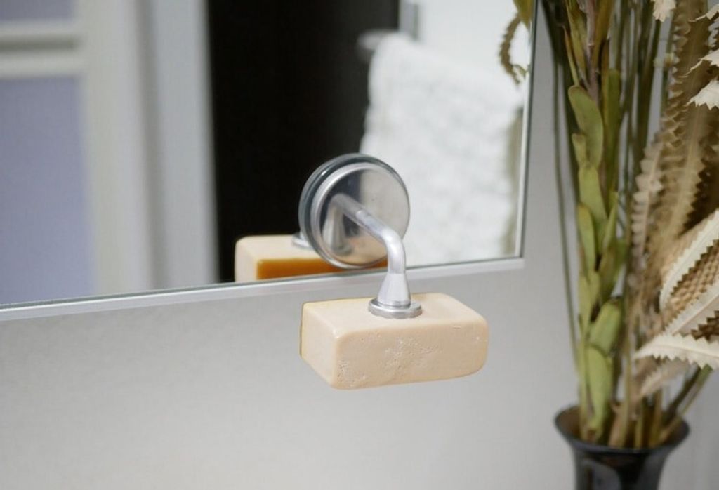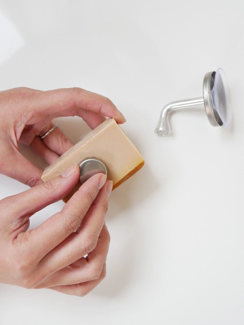 吸盤吸附在鏡面或滑面磁磚上,再將鋸齒鐵片崁入肥皂中,這樣一來磁鐵就可以牢牢的把肥皂吸附在上面喔。