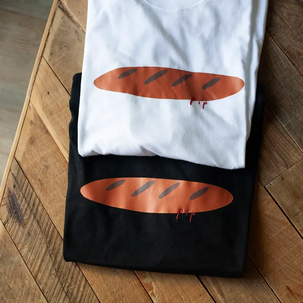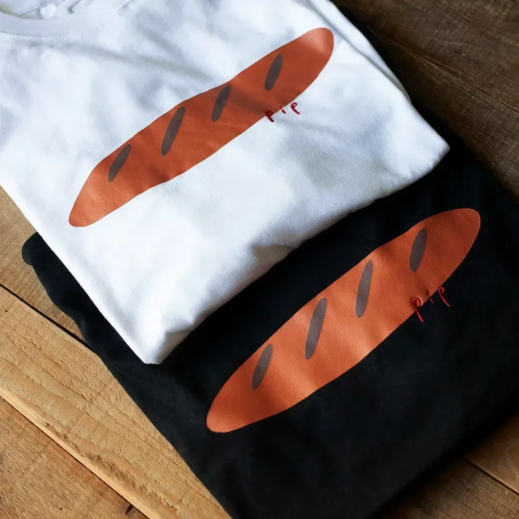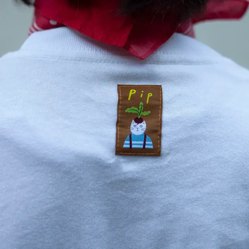 胸前的法棍上繡著 Pip 的刺繡簽名,背面領口還縫製上了 Pip 的照片!