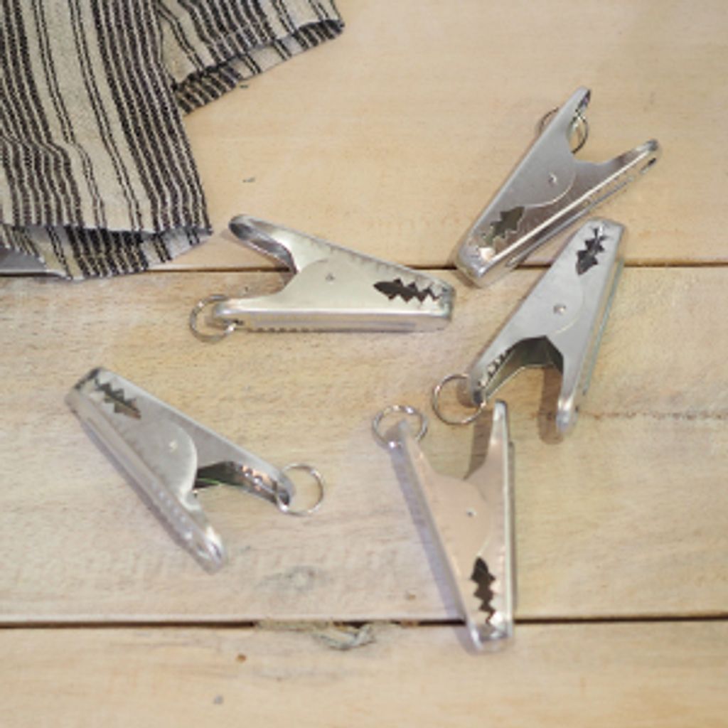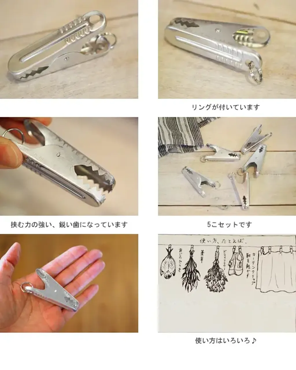 款多功能鋁製夾子! 這款夾子抓力強勁。 強勁的彈簧和夾齒能夠牢牢 夾住重物或黏黏的物品。 它們非常適合懸掛重達2公斤的物品。 用途廣泛! 夾子配有圓環,您可以用作 窗簾夾、懸掛乾燥花一套五個請注意:由於夾子強度高,夾齒非常鋒利。請小心操作。