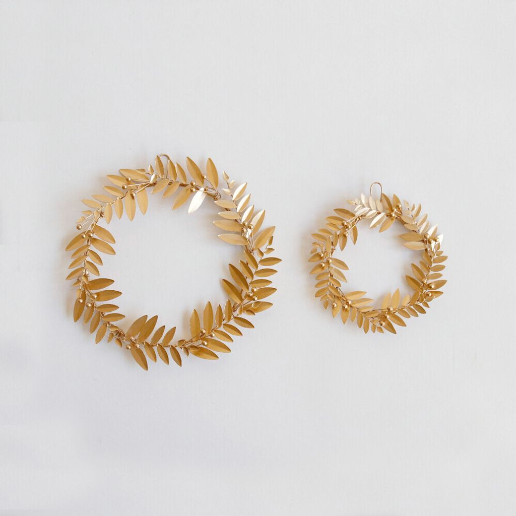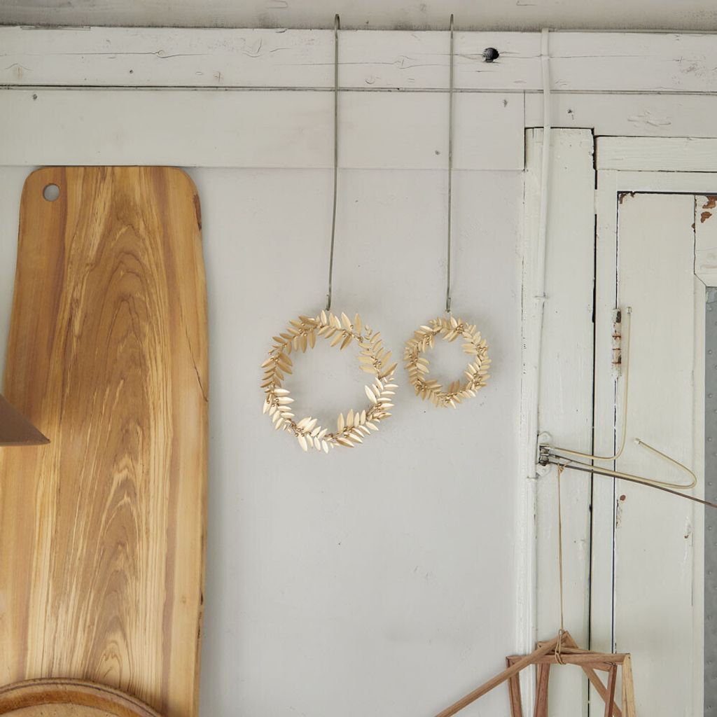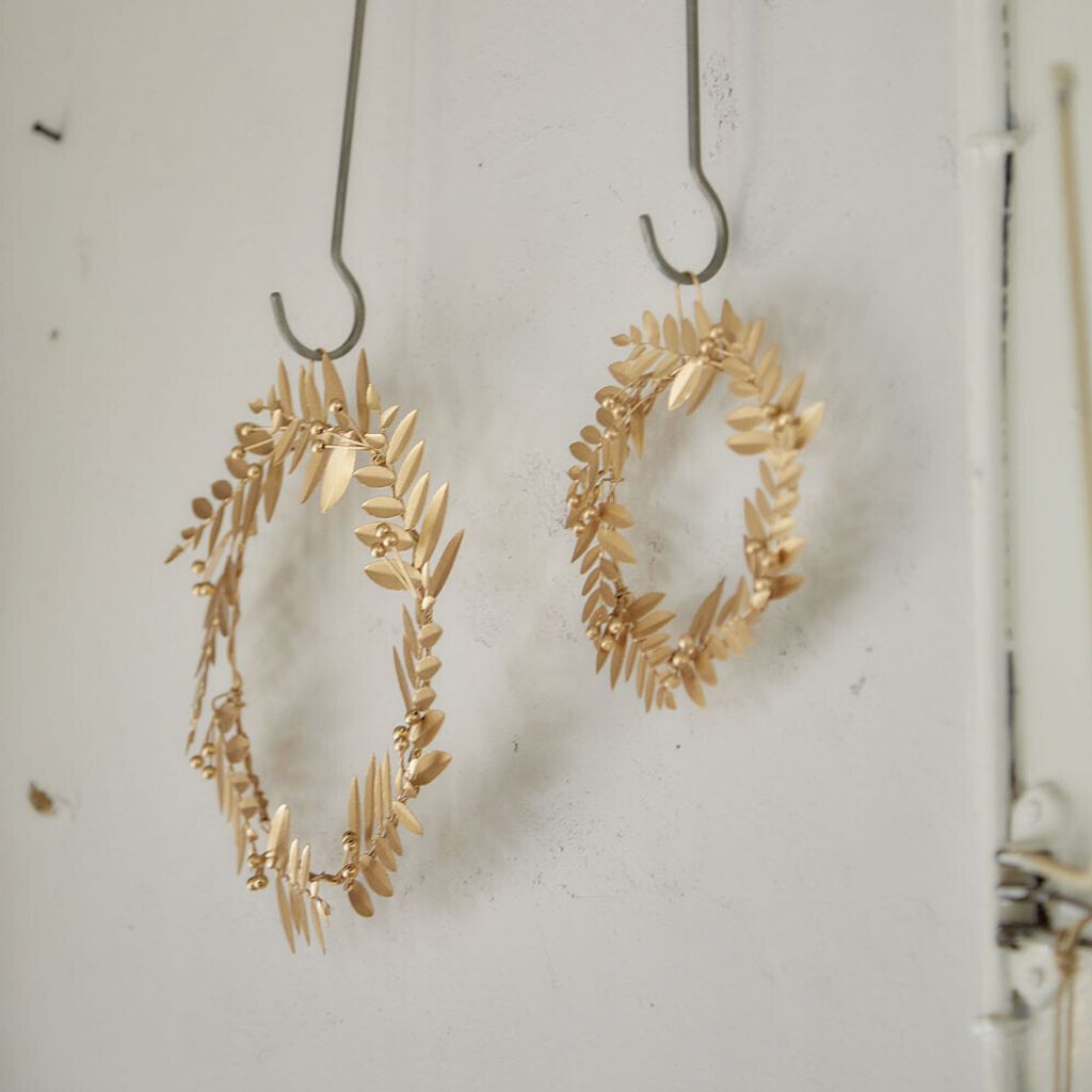由一片片層疊的葉子組成,這款錫製花環彷彿閃著小小的光澤,散發著冬日的溫暖氣息。隨意搭配的南天竹,靜靜地點綴在其中,讓整體變得更加俏皮又可愛。