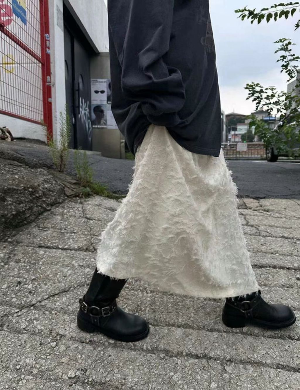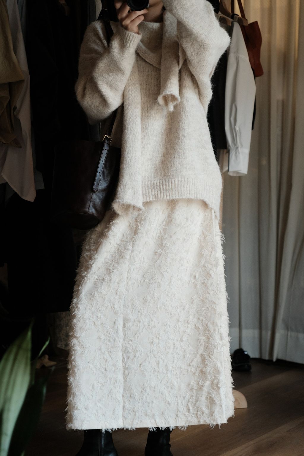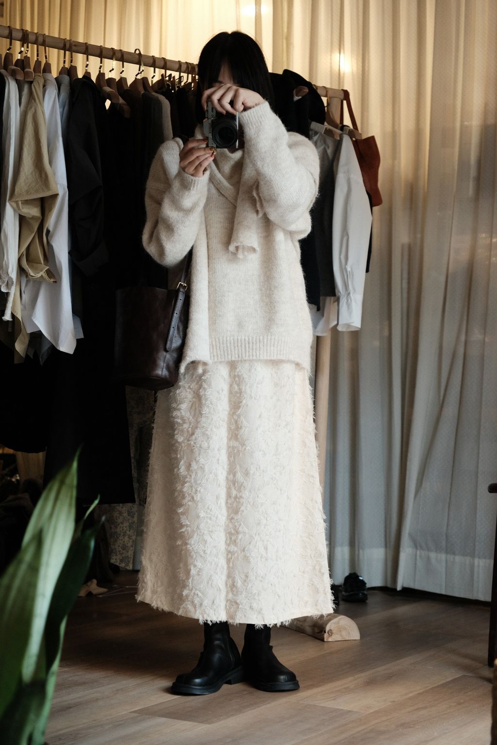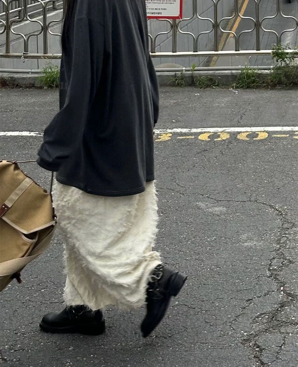 那種若隱若現的毛鬚感讓整件裙子多了份時髦與層次,低調卻很有存在感。版型是修飾度很高的直筒長裙,長度剛剛好,不壓身高、反而顯腿長。
