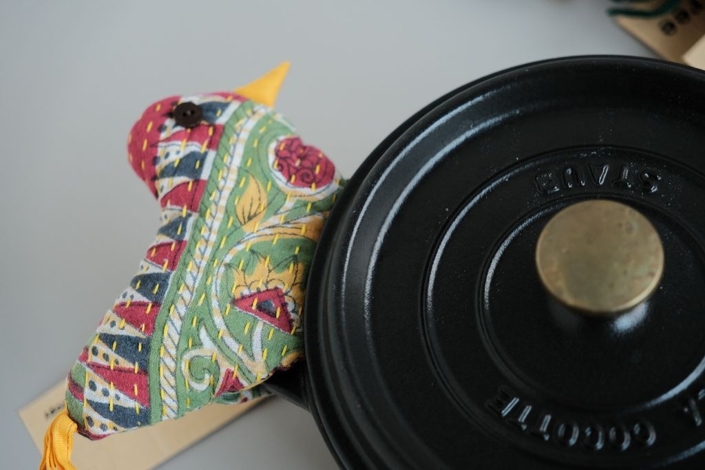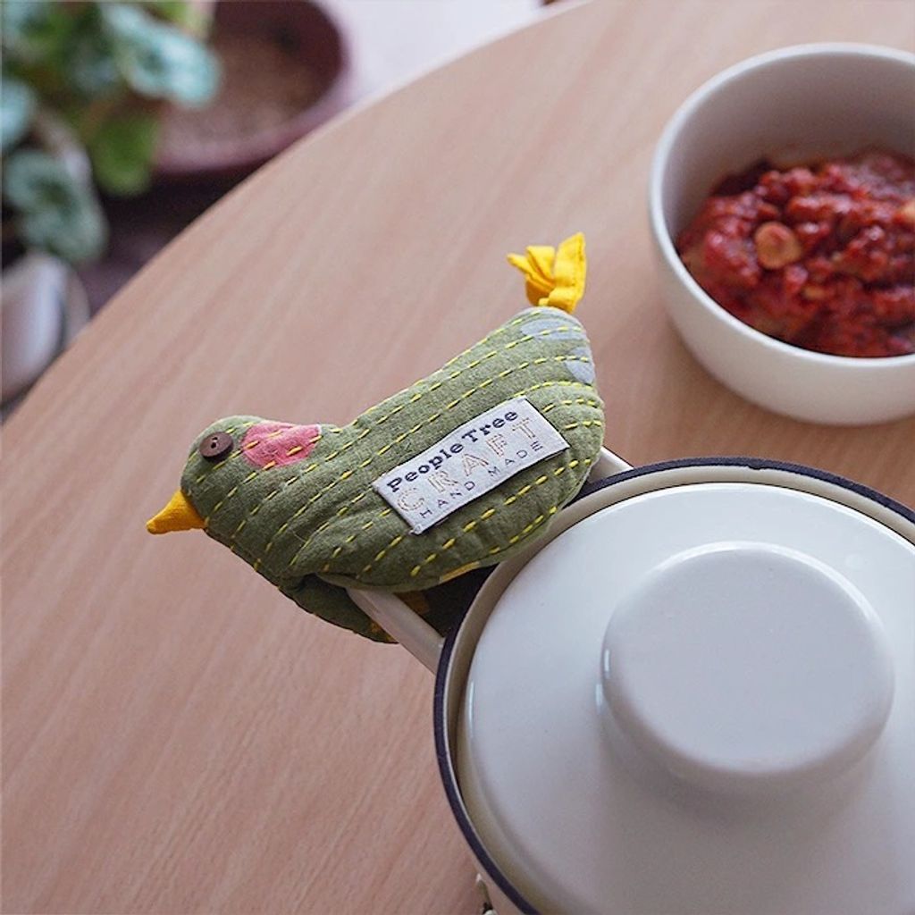 我愛用鍋帽好多年了,可以當鑄鐵鍋的鍋蓋防燙,兩隻一起也可以直接雙手使用當作隔熱手套。 日本的People Tree是一家日本從事「公平貿易」購物的品牌,與亞洲、非洲和南美洲 18 個國家的約 145 個組織一起,規劃、開發和銷售,盡可能使用當地採購的天然材料(包括有機棉)等手工產品。透過利用手工編織、手工刺繡等手工藝,為發展中的國家和社會弱勢群體提供收入機會。這隻小鳥鍋帽就是在這樣的背景下產出。